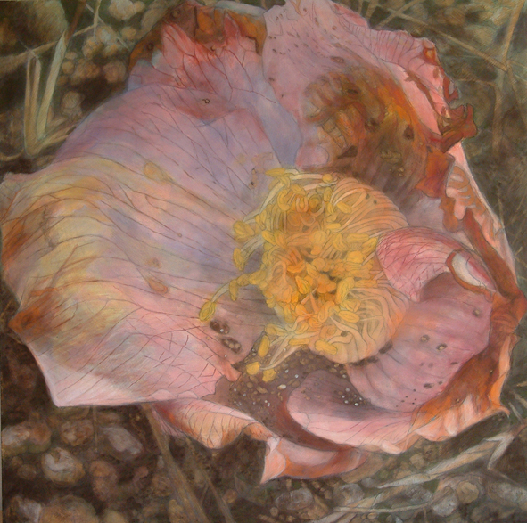 日本画制作は180x270 cm の大作を描き、その後 小品では全く別の視点から、部分をクローズアップしたものをトリミングし、それが何か、花の形状がわからないようなアプローチを試みた。しかしどうしても形を描かないと、しっくりいかず、また元に戻るという試行錯誤の中にいる。枯れた花に、「わび、さび」 を感じるという人もいるが、私の意志としては、個体、種としての生と死、とりわけ生態系の危機的状況を憂いたものとして、物言わぬ花を描いてみようとしたものである。