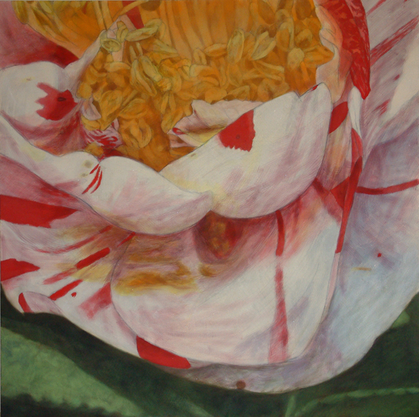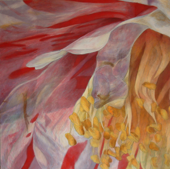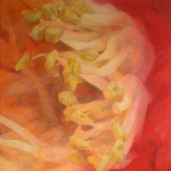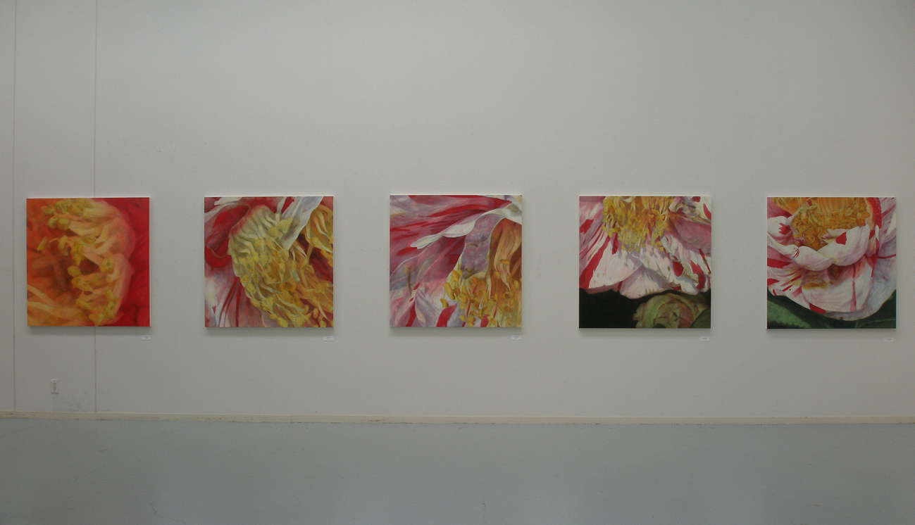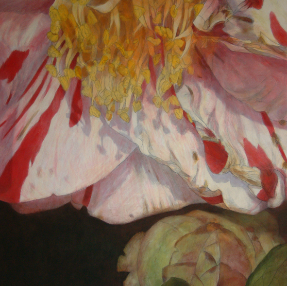 このテーマは以来ずっと続いていて、それをどうしたら表現できるのか、未だ模索中である。2008年に「生命の記憶」 というタイトルで続けてきた作品は、2009年より、少し変化し、同じく花のクローズアップではあるが、枯れかけた花、とりわけ落ちた椿の花を描くようになった。このテーマでいろんな花を描いてみたが、一番多く描き、テーマにあう花は椿であった。それは椿の花が大振りで、特に雄しべ、雌しべの部分が大きくはっきりしていることが最大の理由であるが、椿の花が地面に落ちている姿を見て、まるでまだ生きているかのように生々しく美しい姿に、ドキリとさせられたのが、この「生命の変遷」シリーズへの移行のきっかけであった。
