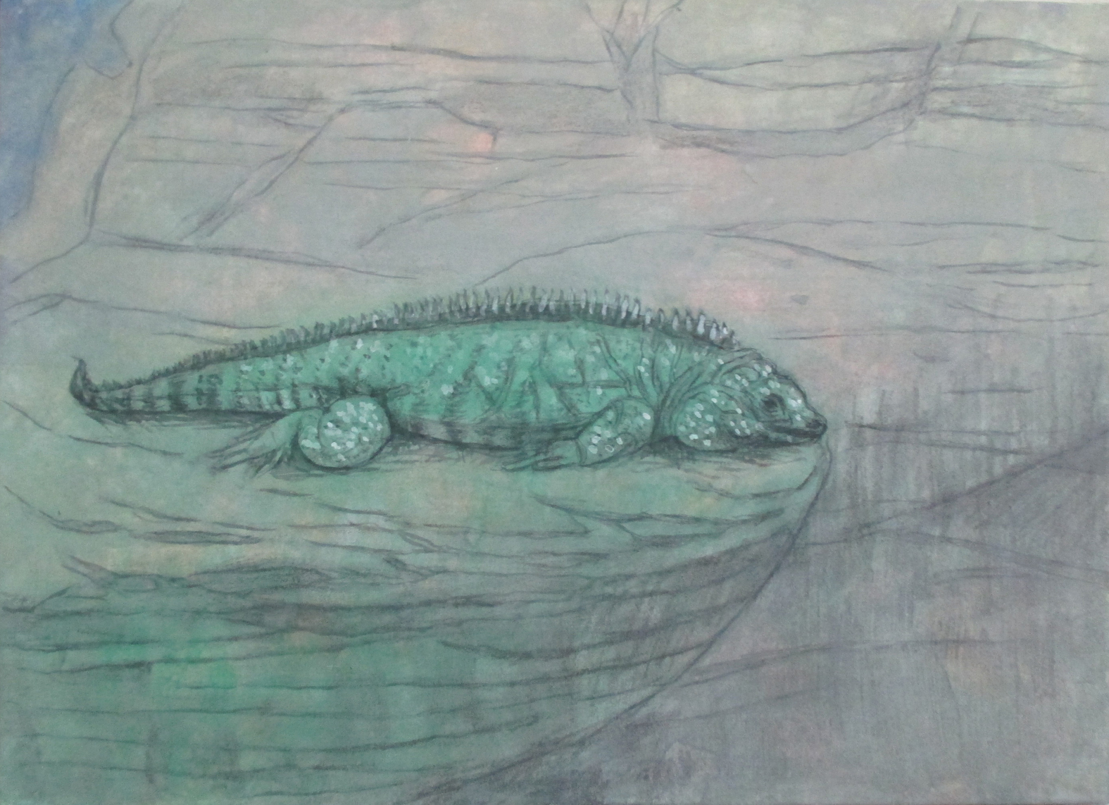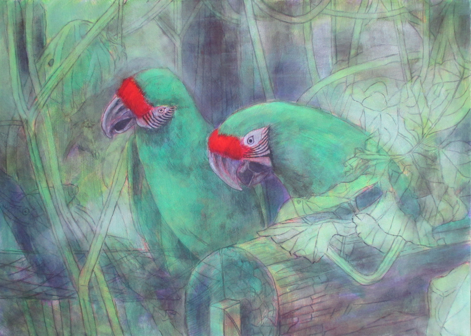 岩絵具を使った日本画や木版画で表現しているのは、実際触れることのできない自然そのもの(生態系のシステム)に、少しでも手で触れるような感触を得たいとの想いから、素材(絵具)の物質感にこだわったためだ。