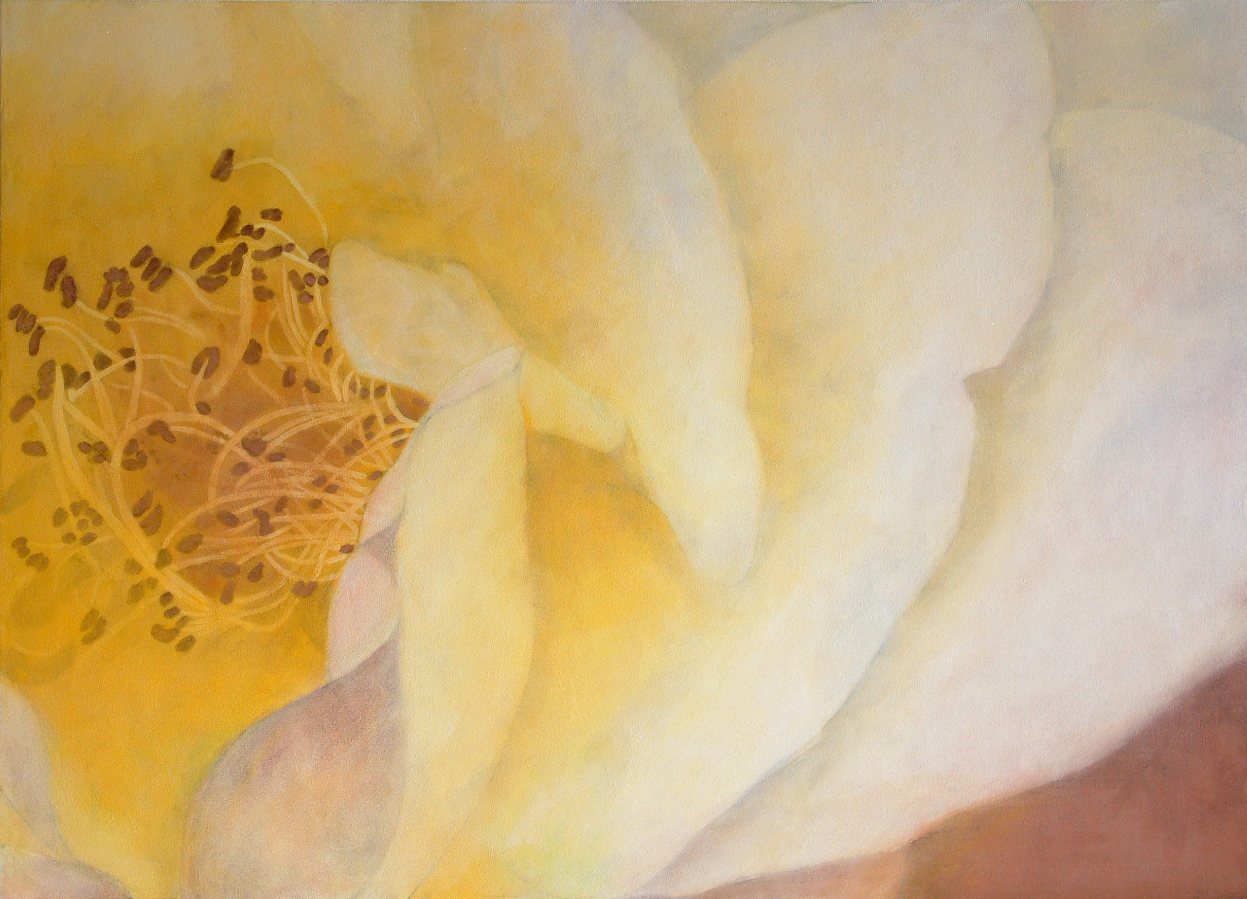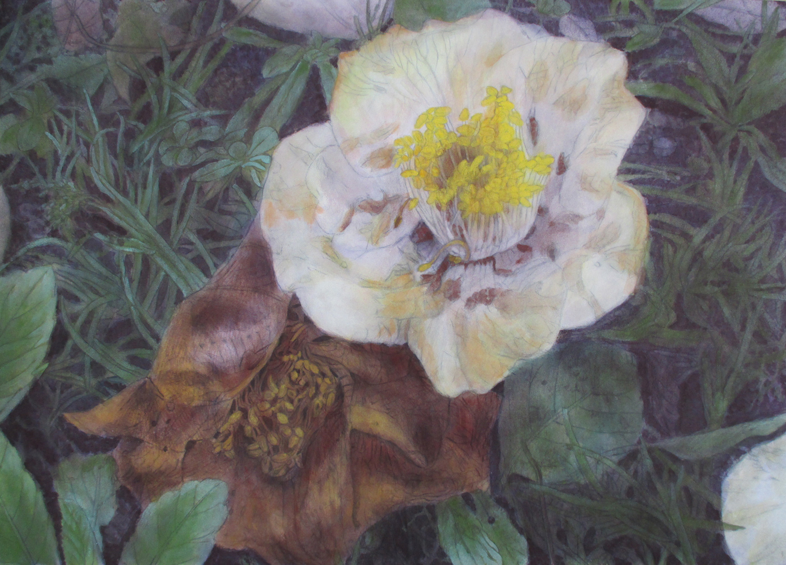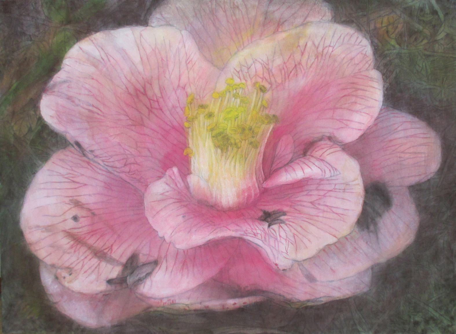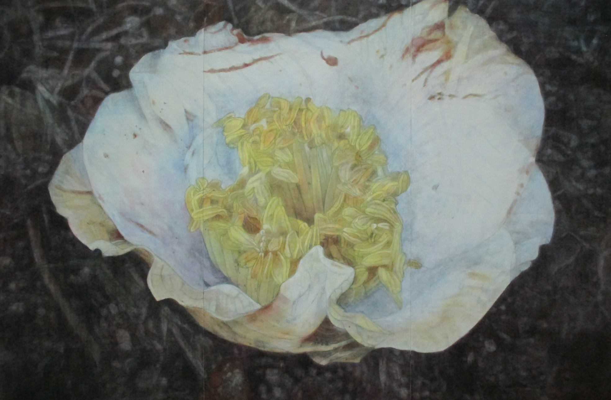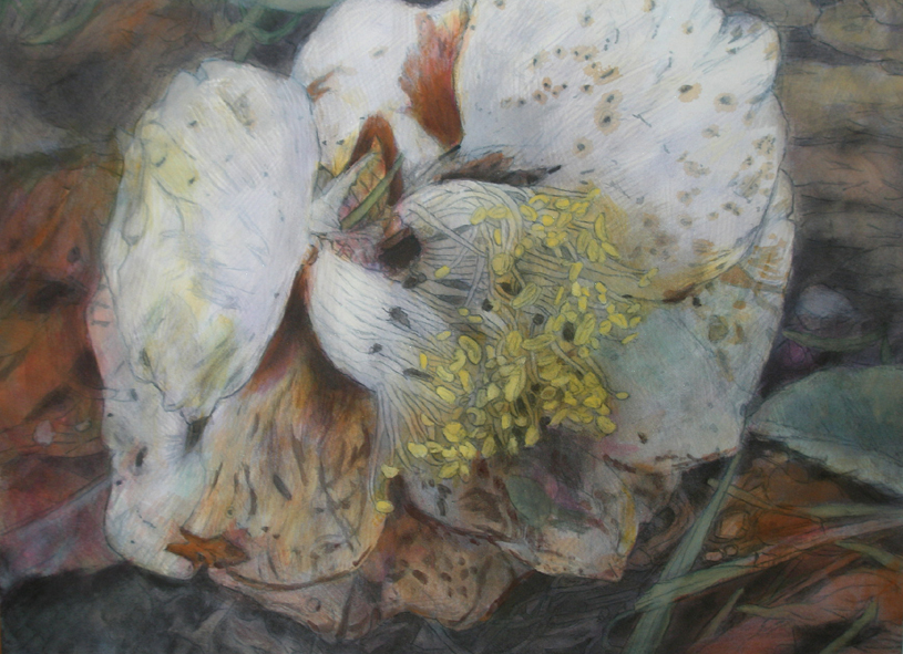 はじめはまだ若くて美しい花を描きましたが、やがて生命の変遷シリーズへ移行すると、今度は枯れかけた花や、地面に落ちた椿を描くようになりました。